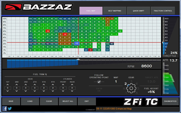 Load and save fuel maps that are downloaded, manually edited, created on a dyno, or made with the Z-AFM air / fuel self mapper.